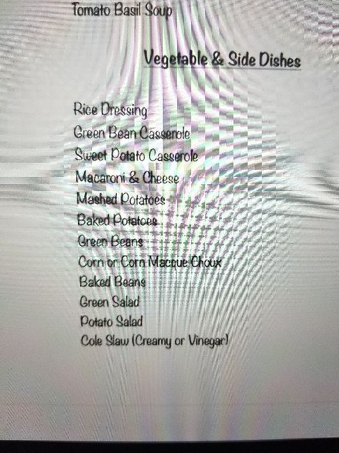 With jambalaya and chicken fettuccine as the main entrees.. pick 2 sides (we already have items to accommodate vegetarians and those with food allergies)