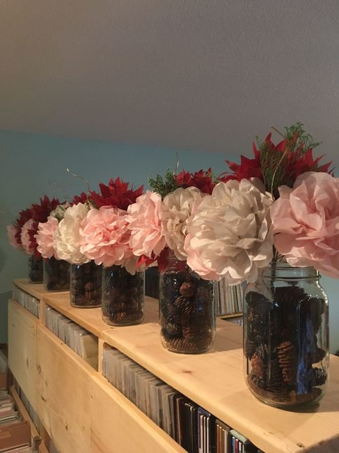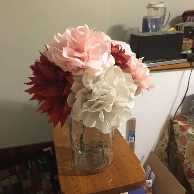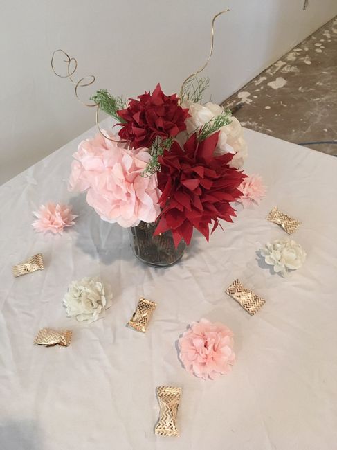 Just did a trial run of my centerpieces! What do you think? Should I add or change anything? 1. Ignore the wrinkled bedsheet table cloth - just using for a sense of color. Lol 2. There will be more paper flowers that are less crumpled. 3. The gold...