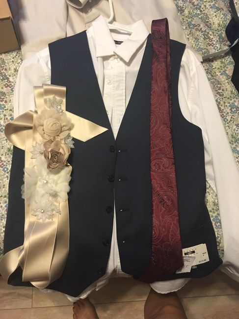 Hi! I can't tell if I'm just having a bridezilla moment but I'd appreciate your feedback! I can't decide what color shirt I should have for my groom. The sash is the same color as the first layer of my dress, which has an ivory top layer. I feel like...