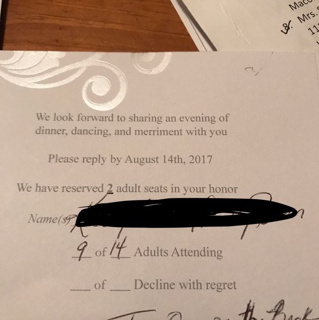 The initial number I gave to my caterer was 125. I have received most of all my rsvp back and I'm at 160. What in the hell? I've had people rsvp back with 14 people and 6 people. When the invite clearly says 2 seat have been reserved and Adult...