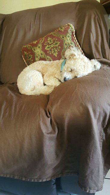 Snuggling on the couch with pup tonight drinking wine since DH doesn't come from his work trip until tomorrow. I moved the slightest bit and she Weasled herself into my spot and stole the pillow. She loves watching tv-especially if there is animals...