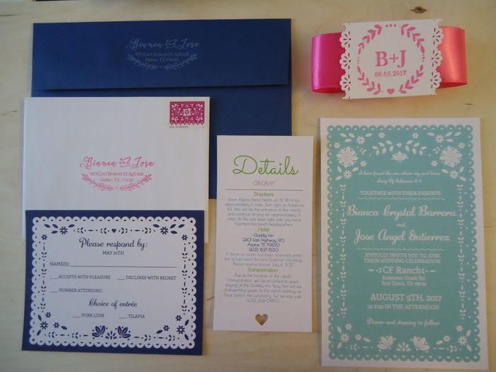 I'm about half way done preparing invitations and I wanted to share! I absolutely love my colorful invitations. They go perfect with my fun fiesta themed wedding. I even found papel picado postage stamps Show me your invites!