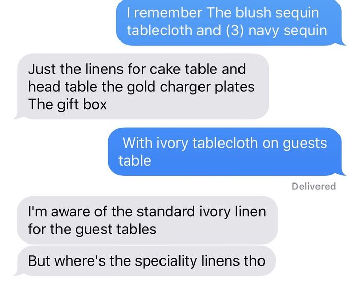 I'm not even sure how to word my own post! Finally in the single number digits. My wedding coordinator send me this text! I wrote a post about her a few weeks ago.. took everyone advice! Today I just annoyed her. WTF would I need sequin tablecloth...