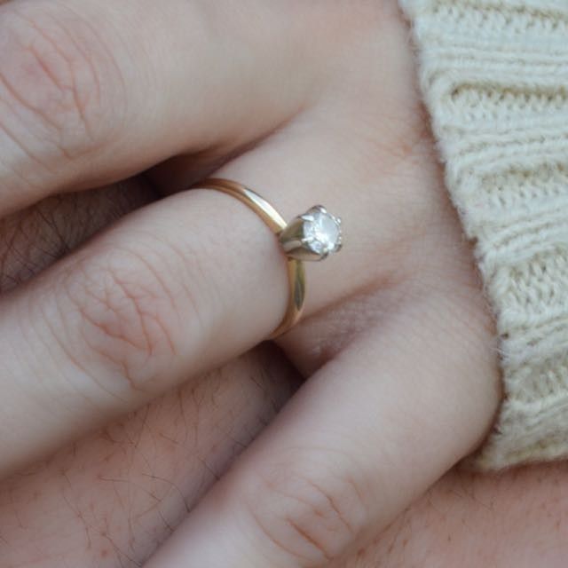 My FH proposed in Paris during a trip in January, and he had planned a custom ring, but unfortunately it would not have been ready by the time we left for trip. So in the meantime he got a small .10 carat ring just because he didn't want to NOT...