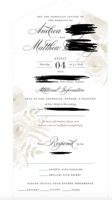 Hi y’all! So I could use some advice of my invitations! We’re planning on adding a spot for vegetarian by menu options and something like “we have reserved ___ spots in your honor.” Anything else? Thanks!