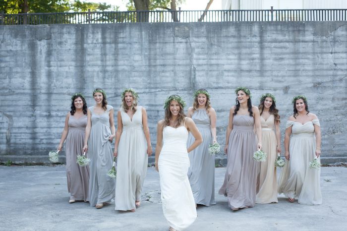 I love this look of different colored dresses from Azazie, and just wanted your ladies opinions on the frost color (first to left of bride) is it too close to white? I really like it but am not sure if it's too light. Thanks!