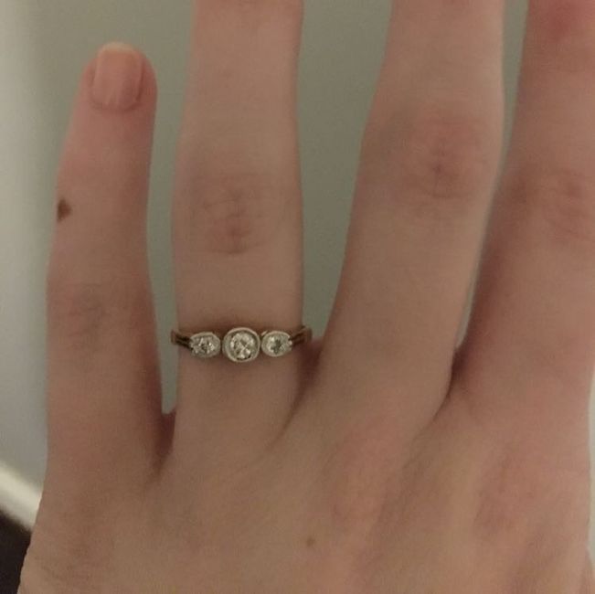 My FH proposed in Paris during a trip in January, and he had planned a custom ring, but unfortunately it would not have been ready by the time we left for trip. So in the meantime he got a small .10 carat ring just because he didn't want to NOT...