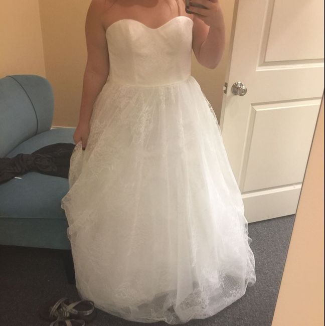 I finally got to try my dress on! When I ordered it, the only size they had in store was so small so I never got a great idea of what it looked like on. I love it! Sorry about the bad lighting! The only part I don't love is how my back and arms look...