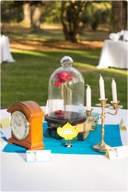 Hi everyone! So my mom and I are on the fence about adding extra decoration around the centerpieces. We are doing an "Elegant Disney" theme that has been leaning more towards Beauty and the Beast. Our colors are navy blue and silver, and the table...
