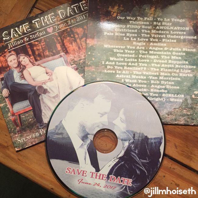My fiancé is really into music (we have a recording studio in our house!) so we wanted to do something that showcased that somehow. I designed these Save the Dates printed on CD jackets and he came up with the playlist. Our guests are loving the CDs...