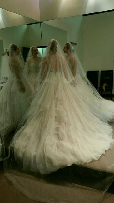 So I already purchased a veil which is fingertip length with lace appliques and rhinestones. Now, I feel like I want to exchange it for a drop Cathedral veil. The one I bought was the first one they put on me. Any of you are doing this style veil or...