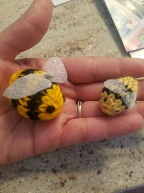 One of my mom's good friends made a bunch of these knitted bees for my wedding! The tiny ones are my favorite, they're so adorable. I'm thinking of sticking them on a thin wire so it'll look like they're buzzing around the centerpieces.