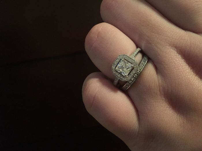 Hey ladies! My DH surprised me with a new ring last night on our 4 year (since we starting dating) anniversary. I love love love it! Only problem is that it pushes off my wedding band. I am now looking for a new one. Any ladies with rings this style...