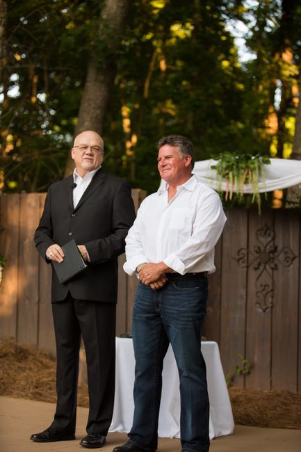 Our officiant is a family friend & keeps asking me what he needs to wear.. we're having a rustic themed wedding & the guys are wearing jeans, white long sleeve button ups w grey vests & bow ties.. i dont want the officiant in the same outfit as the...