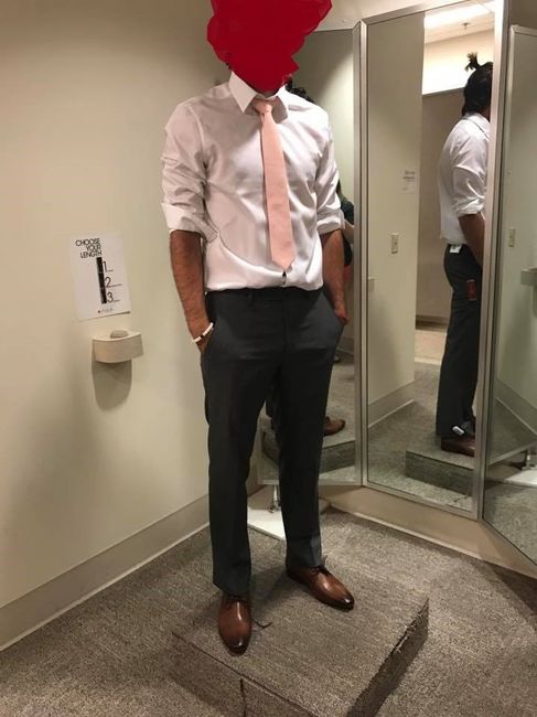 FH and I are leaning more towards the Navy tux with the vest, I wasn't sold on the suspenders, but we aren't sold on it yet. The other option is dark gray. Our colors are Mint (bridesmaids dresses will be this color), Peach and Gold. We held up mint...