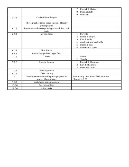 Hi there! I'm looking for a bit of help arranging my day-of timeline. Here are some important details: - Ceremony: 6-6:30, Cocktail Hour 6:30-7:30, Dinner 7:30-?, Reception ?-11 - 9 People having pro hair and makeup done - 8 hours with photographer...