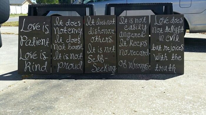 I started working on my corinthians 13 boards to have down the aisle! At first I tried using stencils, that did NOT go well, so I decided to just free hand it. I must say I'm pretty proud of these! Just need to finish 3 more boards!