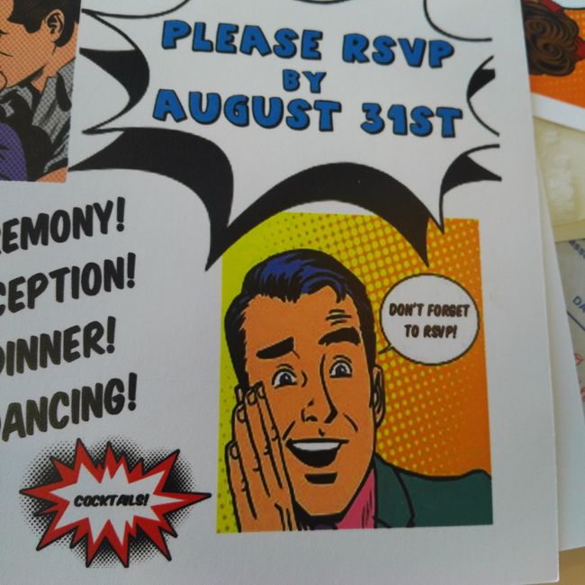 UPDATE: we listened to everyone and changed the "No Gifts Seriously" to "Don't forget to RSVP!" Our wedding has a comic book/ movie/ art theme and we designed our invitations on the computer in addition to drawing our faces. So excited! Here is the...