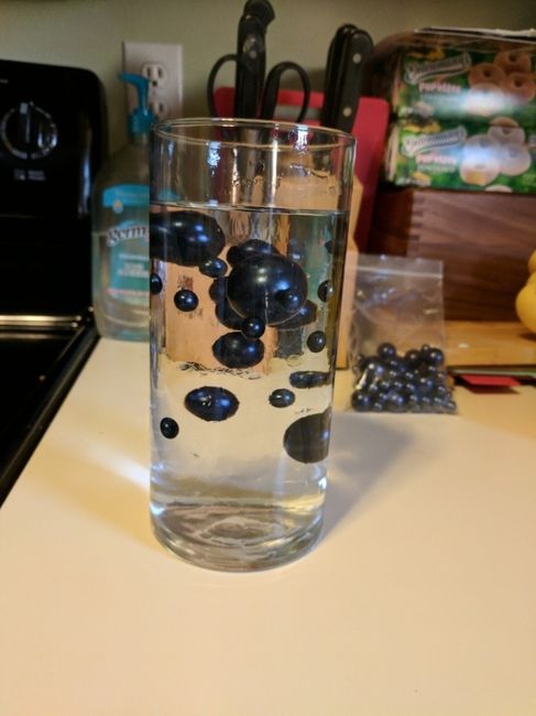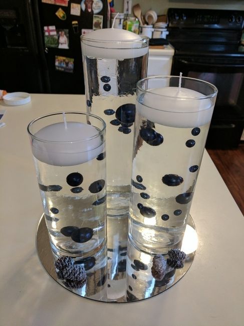Here's a mock-up of my centerpieces. I think I'm also going to get some white floating pearls to mix in with the Navy. There will be more pinecones and a silver table number in the front, middle. All on a Navy table runner. Thoughts? I might also add...