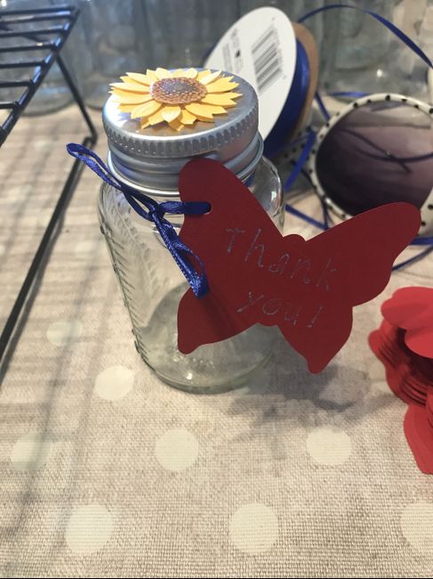 Putting together the favor jars! Made the butterfly on the Cricut, made custom stamps for the “Thank you!” It’s coming together!