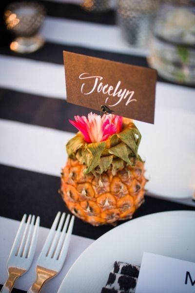 We are having a tropical/luau wedding. My original plan was to have minimal decor. Pineapple centerpieces, paper lanterns from the ceiling and give every guest a lei, which from an outside perspective would add the extreme pops of colour to the room...