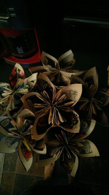 Here's my centerpiece idea. Gold striped vase with comic book flowers, 2 wine bottles with wine bottle lights, and candle votives on the tables. My colors are gold, eggplant, and lime. I found these at Target and instead of using a runner thought...