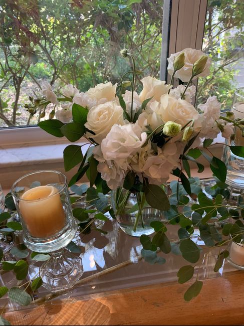 I had my centerpiece mock-up today! White and clear are our colors. We are doing long tables (two long rows to be exact), so this set up will continue on each table all the way down.