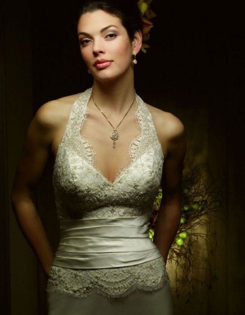 Who is wearing a halter top wedding dress? What jewelry did you choose to go with it? Mine is not a high halter top, just the straps. It has beading on it so I was originally going to wear larger earrings but I think I've decided to go with a pearl...