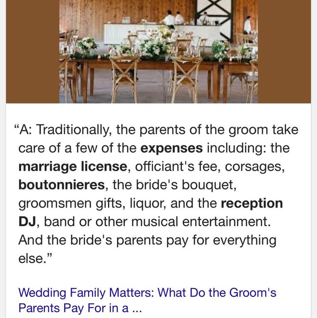 Hi everyone! My parents have given us a budget to work with. But we are wondering what groom's parents should be/can be responsible for. His parents are happy and ready to help but are doing a good job not stepping on my parents toes being the brides...