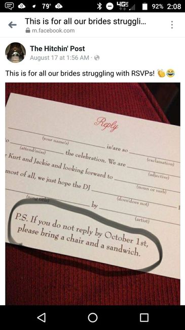 Getting ready to mail my invitations and my sweetheart sent me this. I wish I could be so bold. But seriously folks, please respond..... Because if you don't bring a chair the only available seat is going to be made of porcelain.