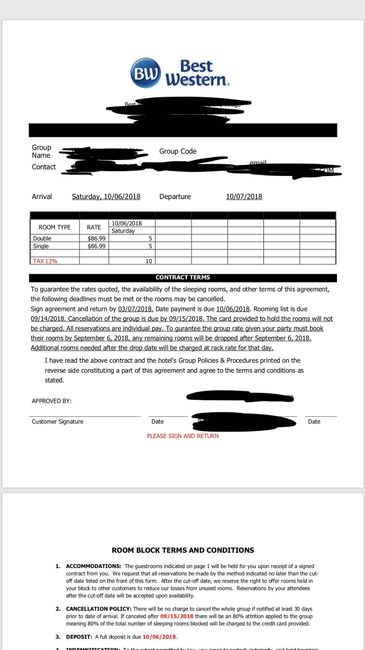 Ok so to do my hotel blocks, I have to put down my credit card to hold them. I asked several different times that my cred it card would never actually be charged for anything, she said yes. I get the contract and the credit card authorization form...