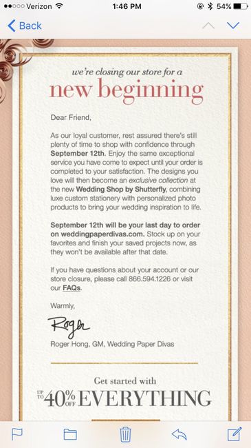 Hey guys, just wanted to make sure those of you with Wedding Paper Divas invited or STDs that if you need extra invites you may want to get them now! Looks like Shutterfly bought them!
