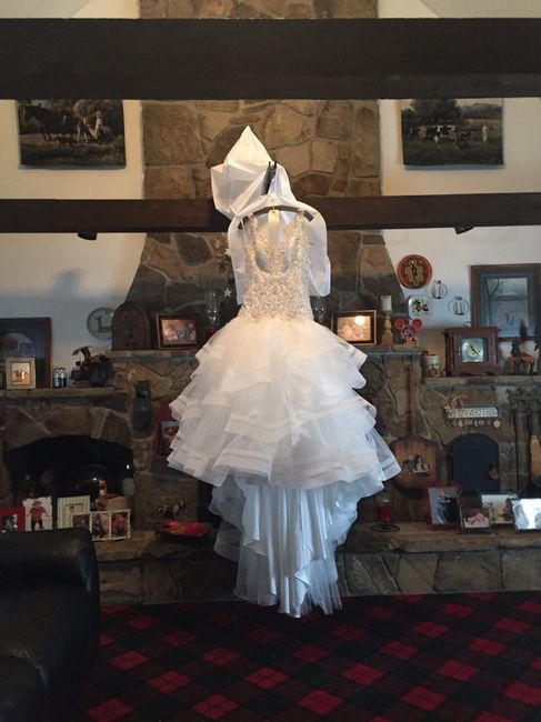 Soooo my mom picked up my dress yesterday - woot woot- and brought it home! Luckily my dad left I’d the chandelier hook from my shower. He literally drilled a bar coming off a beam in our house to hold a rainbow chandelier! He’s the best :-) Anyways...