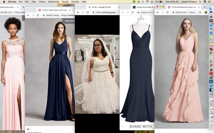 So my wedding colors are navy and blush. I was set on having my bridesmaids and MOHs wear blush while the guys wear navy with a blusy tie/bowtie But today I was in David's bridal and saw navy dresses next to blush dresses and I just loveddddd the way...
