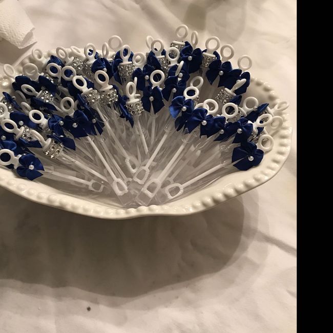 2860 days agoBubbles purchased at Michael’s in pack of 100 count I also brought a cheap hot glue gun, blue flower in small pack of 50 count and sparkle beads on a roll. All done at home and by me. Dish was purchased at Hobby Lobby