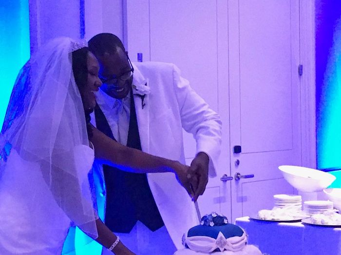 Wedding cake provided by Sweets by LaDawn located in Cincinnati, Ohio. This a three tier pillow cake in colors blue, white and silver