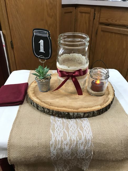 I did a mock up of our centerpiece The mason jars will have white hydrangea and burgundy gerber Daisy's that the florist will bring day of its simple but I really love it!