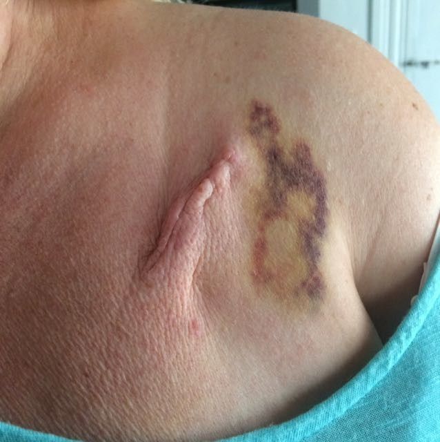 So... May 1st I had a 5"x6.5" lipoma taken out of my left front shoulder. It was tangled in my upper breast tissue. The scar is... well a scar. I feel like it's just who I am now. But had someone ask me if I was going to make sure it was covered? So...