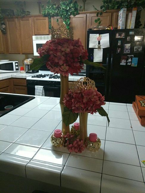 Okay so I couldn't sleep so I decided to do our centerpieces I love them but I feel like its messing something...its a king and queen theme And the vases will be Gold Tell me what you think.