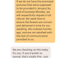 2965 days agoSo, I ordered some custom bouquets and bouts for our wedding party from a well reviewed Etsy site on October 28. We exchanged several detailed messages to fine tune what the end results would be, with the commitment for photos of mock ups due to me...