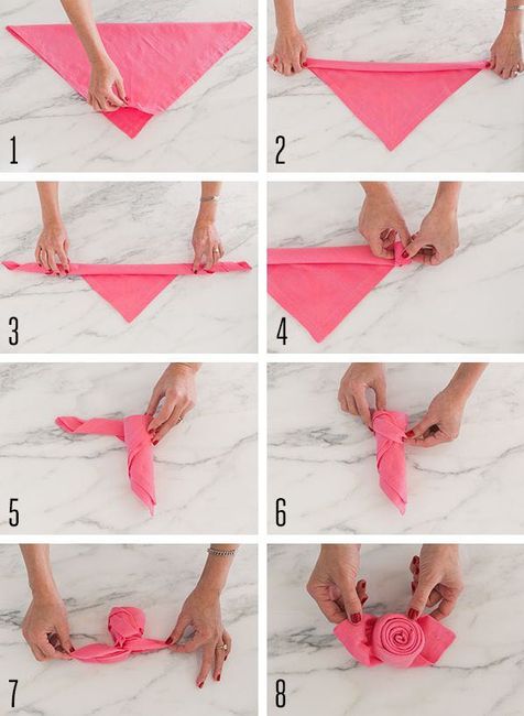 I want to fold all the cloth napkins for my daughter's wedding. I'm envisioning some kind of nice fold but where the napkin is lying down, not standing up. And should we wrap something around it, too? Please send ideas, thanks!