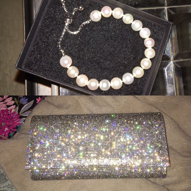 I scored at TJ Maxx today! Freshwater pearl and sterling silver bracelet $25 (the one I was going to order online was $300). Sparkly rhinestone clutch that matches the stones on my dress and shoes perfectly- $16!! Side note- the clutch looks terrible...