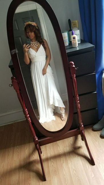 Hey Wedding wire family ! This is my dress, flower crown and barefoot sandals that I will be wearing. The necklace is the only thing that I threw on because it looks sort of similar to my real necklace. Wht do you all think of my full ceremony look?...