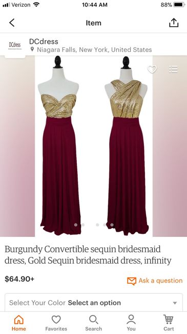 So me and my 4 bridesmaids all live in 4 different states. I figured it would be easier to just buy the dresses online because of the distance. We picked one out from Etsy and everyone was okay with it. It’s a convertible dress so it can be worn many...
