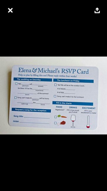 I saw this photo on Pinterest and it just made me laugh. Very cute idea but it’s hard enough for guests to write their names and put the card in the mailbox. I can’t imagine them filling this out 🤣. Any one agree? We are 2 days from RSVPs deadline...