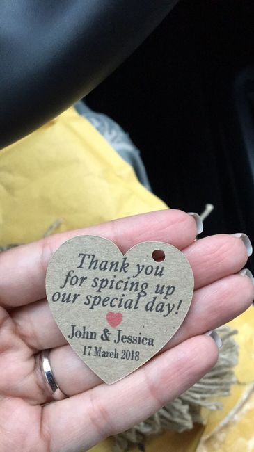 Got my tags in for my wedding favors. They are so cute! P.S. in case it wasn’t obvious, our favors are hot sauce lol