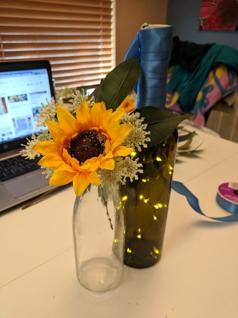 Hi ladies, I'm getting married in 50 days (eeek!). My MOH and I picked up some fake flowers to put together some centerpiece ideas last weekend - not sure if we should go with A or B. In both the wine bottle will have fairy lights (with ribbon...