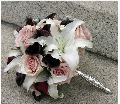 Mine hasn't been made yet, but mine will consist of sapphire colored roses, black latex calla lilies, & babies breath.