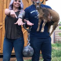 2887 days agoI know this pic is totally ridiculous but I love it! We did our engagement pics today. I thought “hey the ball and chain prop would be funny”. But then FH took it a step further and said he should hold one of our baby goats so it looks like he’s...