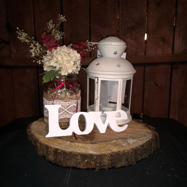 These are the centerpieces- on a white table cloth with a burlap and lace runner then with small votive candles around - what do you think?